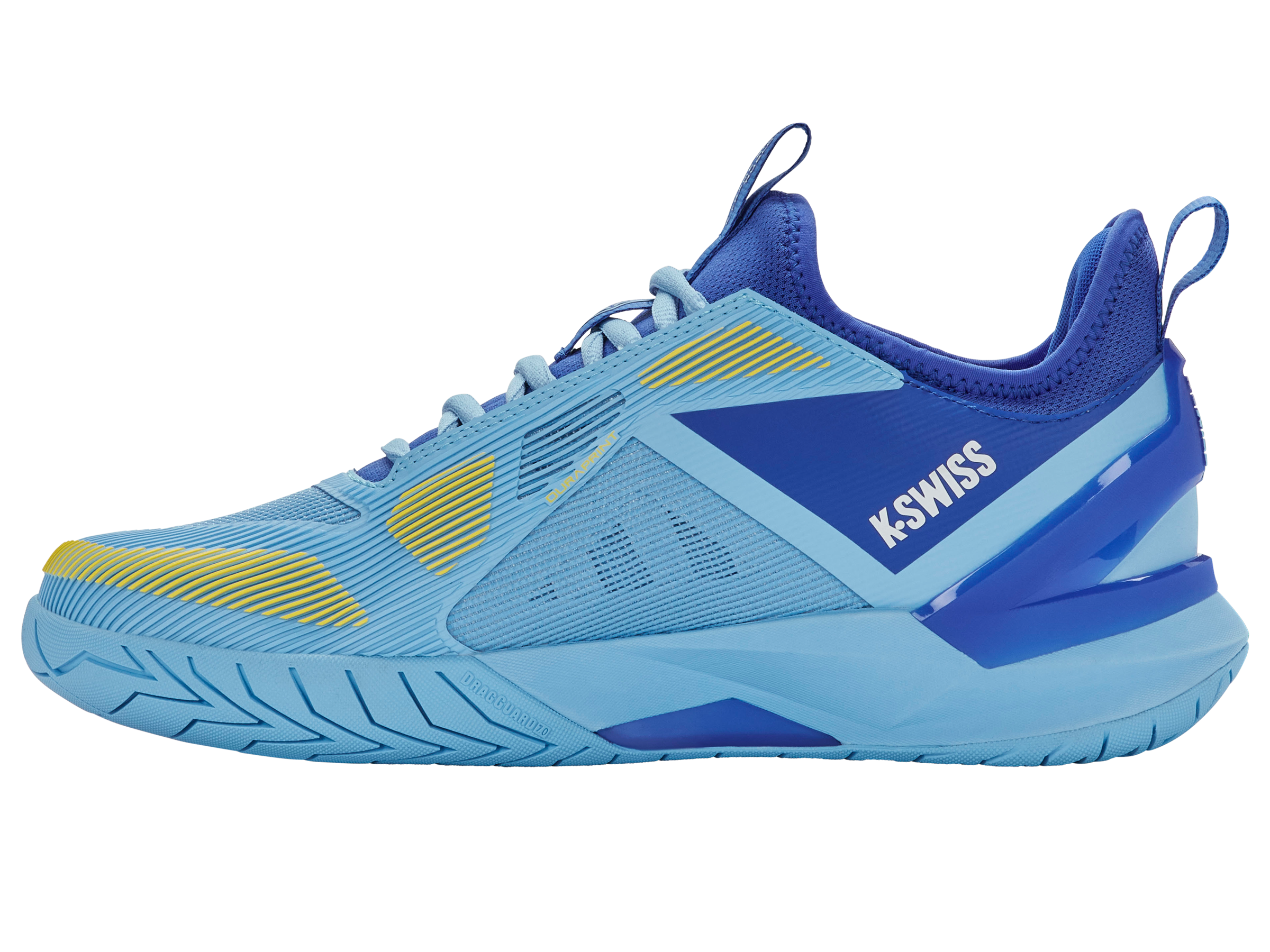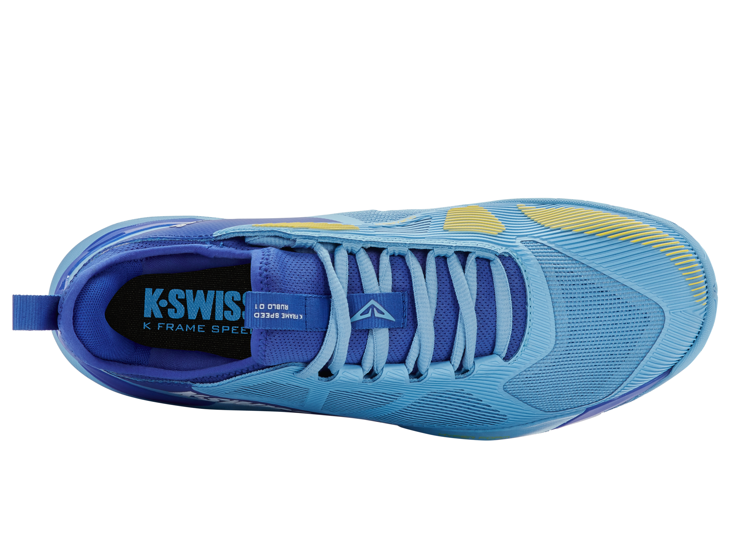 The K-Frame Speed Rublo, co-designed with Andrey Rublev, features a TPU K-Frame for forefoot stability, Hyper Foam midsole for energy return, and a lightweight Duraprint upper for breathability and durability.
