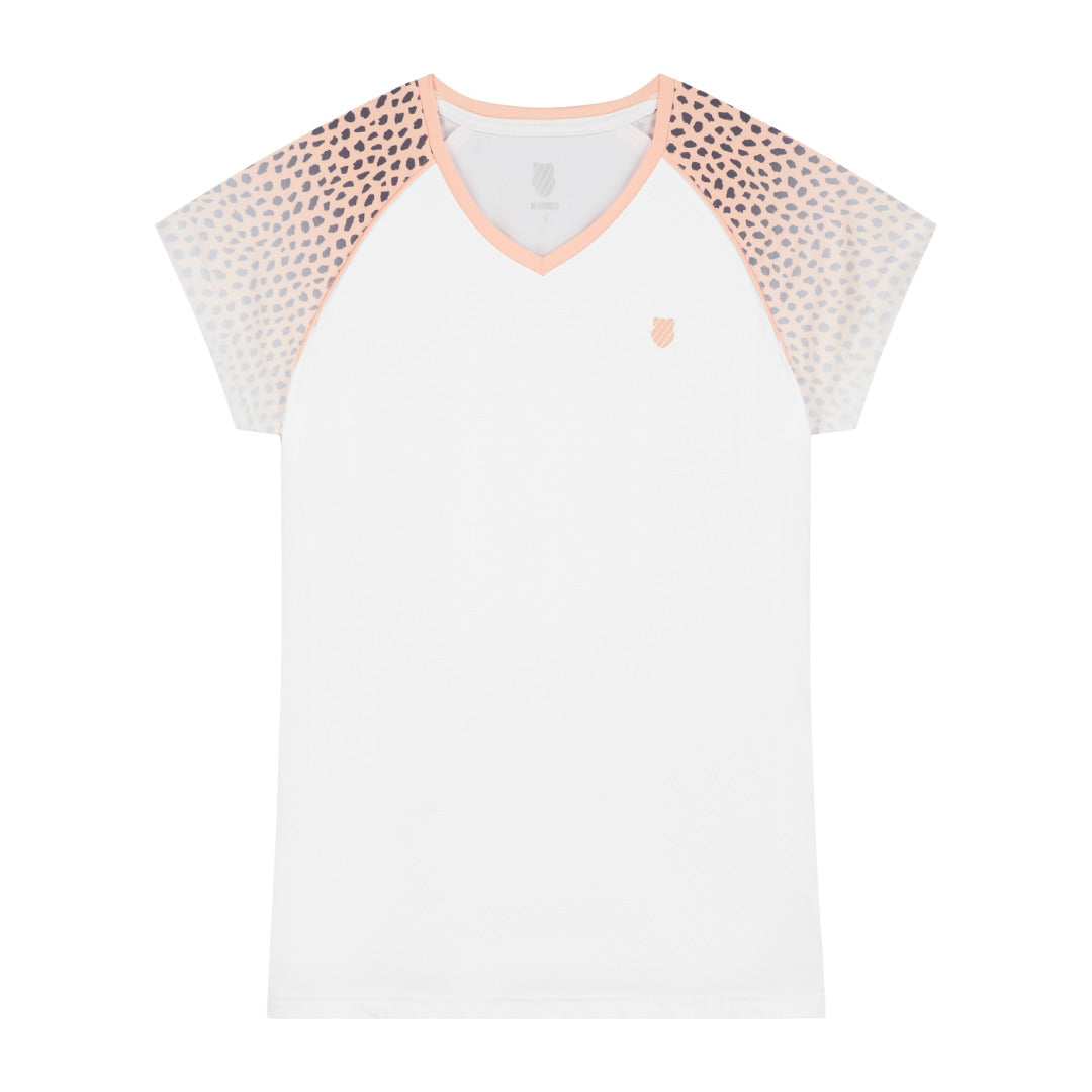 The K-Swiss Hypercourt Top is part of the colorful Women’s Hypercourt collection. Made of 90% polyester and 10% elastane, this sporty tennis top offers ultimate comfort and a tailored fit thanks to the stretch fabric. The v-neck provides easy accessibility and convenience. The tee features a graphic design of on the sleeve and the K-Swiss logo shield on the left side of the chest to ensure the perfect tennis look & feel. The material used feels soft and offers great wearing comfort. The top is easy to combine with the shorts and skirts from the collection The carefully selected colors in the Hypercourt collection are found throughout the entire apparel collection.